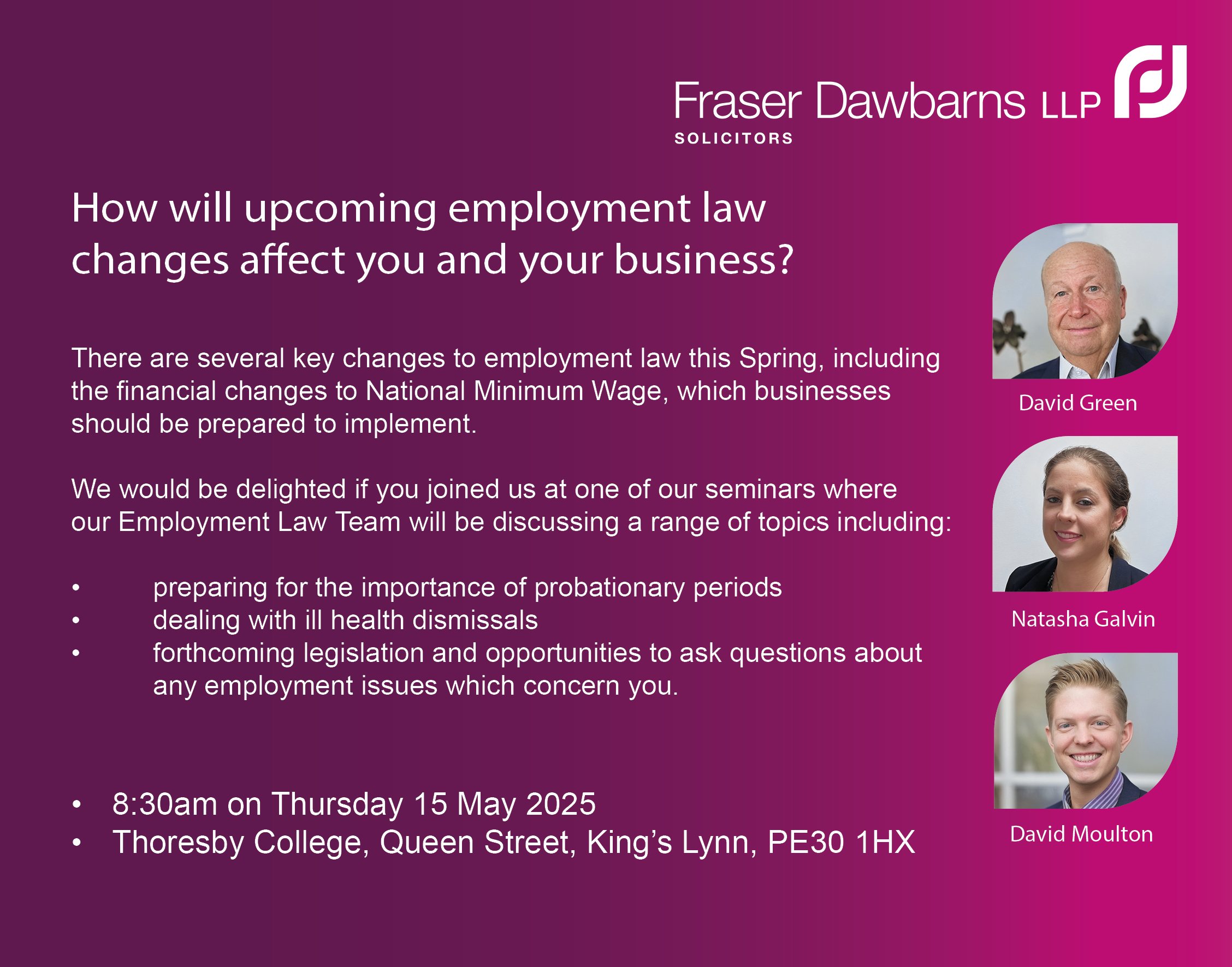 If You Would Like To Join Us For Our Employment law seminar on Thursday 15 May, Please Email Events@Fraserdawbarns.Com